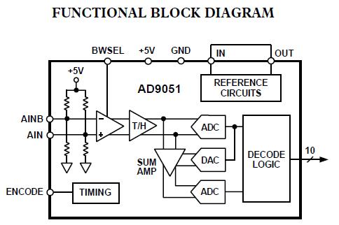 AD9051BRSZ features: (1)60 MSPS Sampling Rate; (2)9.3 Effective Number of Bits at fIN = 10.3 MHz; (3)250 mW Total Power at 60 MSPS; (4)Selectable Input Bandwidth of 50 MHz or 130 MHz; (5)On-Chip T/H and Voltage Reference; (6)Single +5 V Supply Voltage; (7)+5 V or +3 V Logic I/O Compatible; (8)Input Range and Output Coding Options Available.