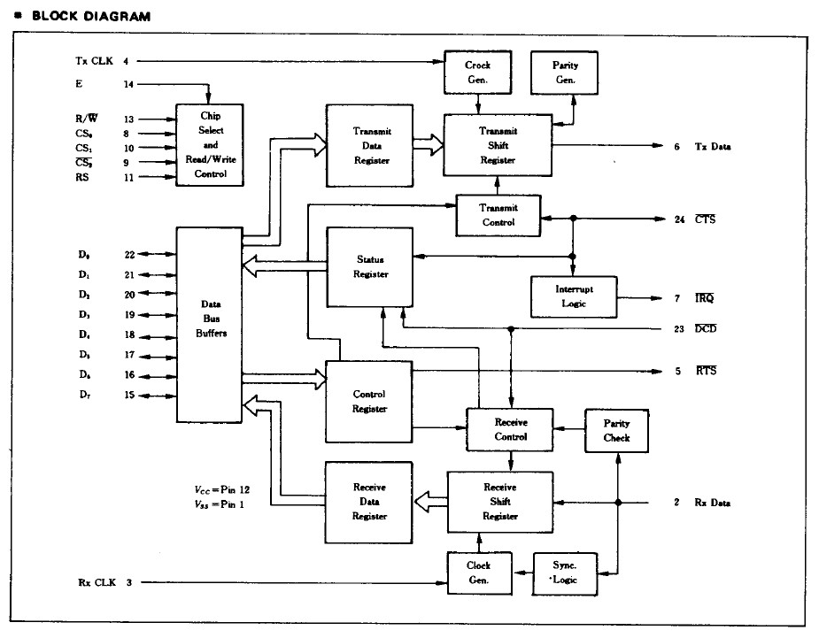 The HD63B50FP Asynchronous communications Interface Adapter provides the data formating and control to interface serial asynchronous data commounications information to bus organized systems. The bus interface of the HD63B50FP includes select, enable, read/writer, interrupt and bus interface logic to allow data transfer over an 8-bit bi-direational data bus. The parallel data of the bus system of the HD63B50FP is serially transmitted and received by the asynchronous data interface with proper formating and error checking.